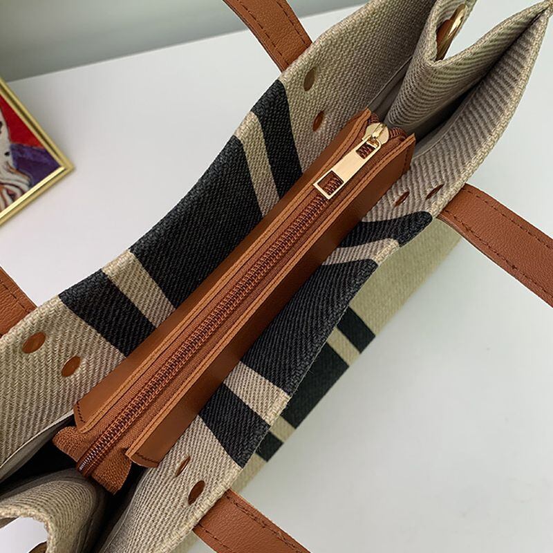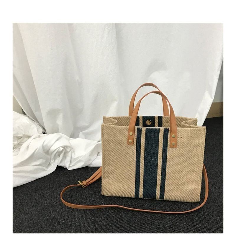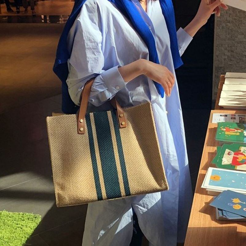 このストライプキャンバスバッグは、丈夫なキャンバス生地で作られており、カジュアルなデザインが特徴です。