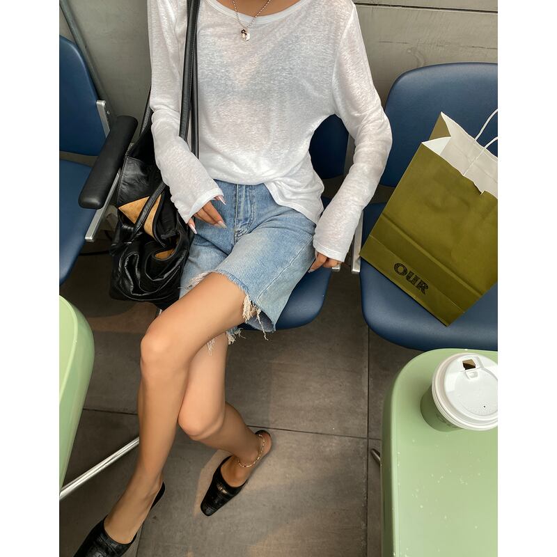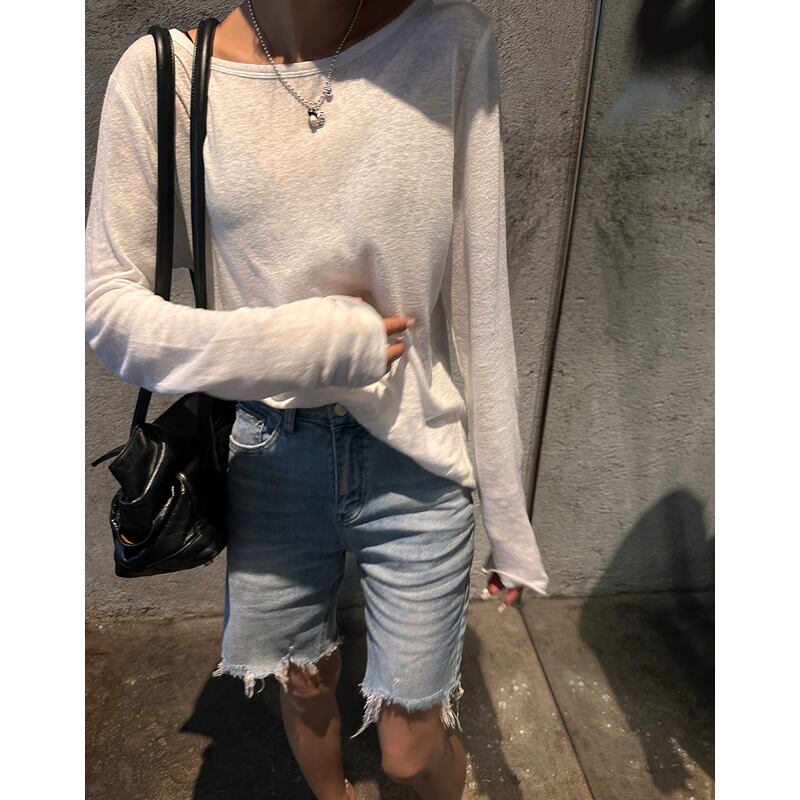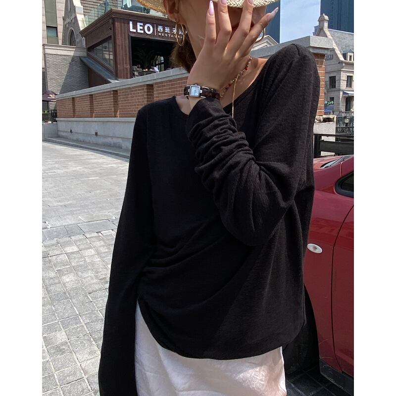 バックUネック長袖Tシャツは、2色展開の薄手のトップスです。