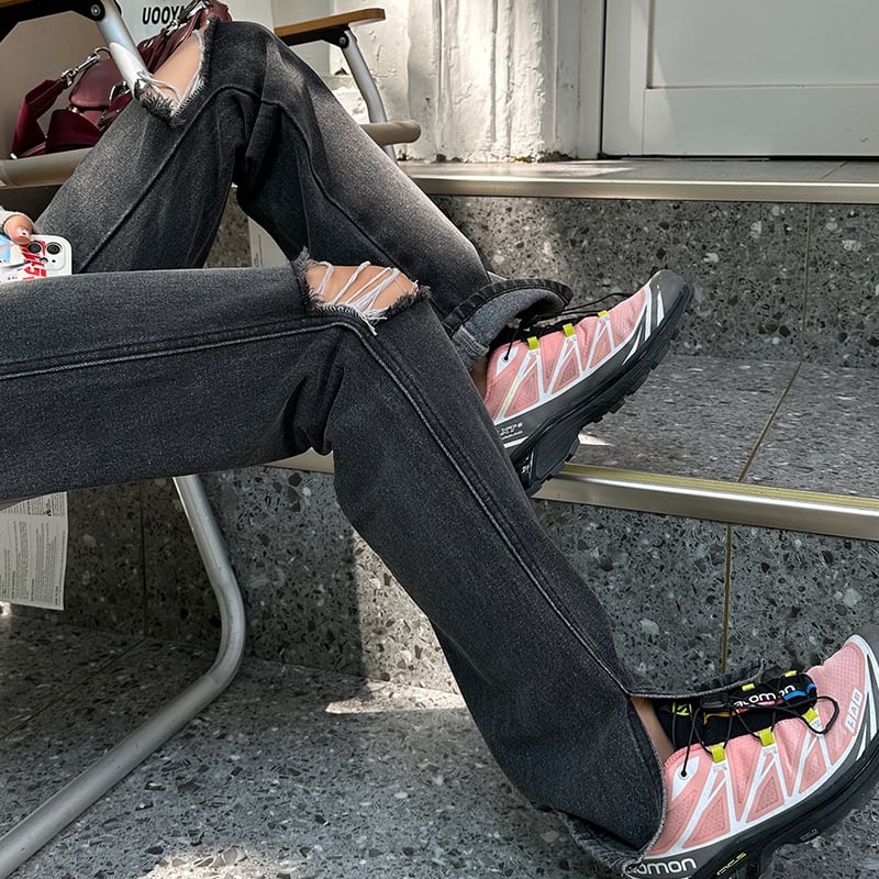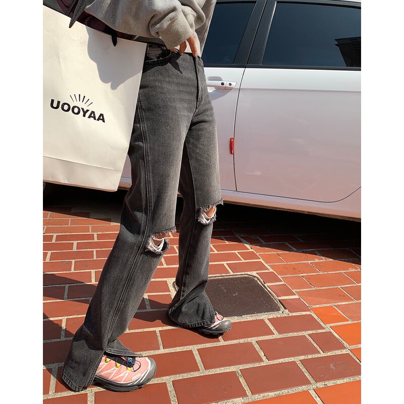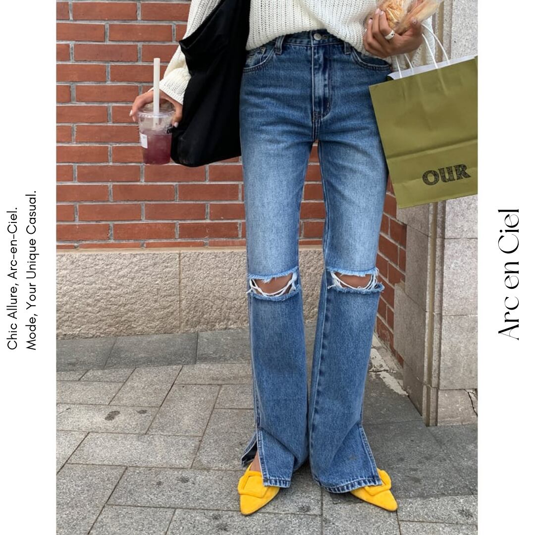 このジーンズは、足元に施されたスリットとリッピングデザインが特徴で、ユニークなアクセントを持っています。