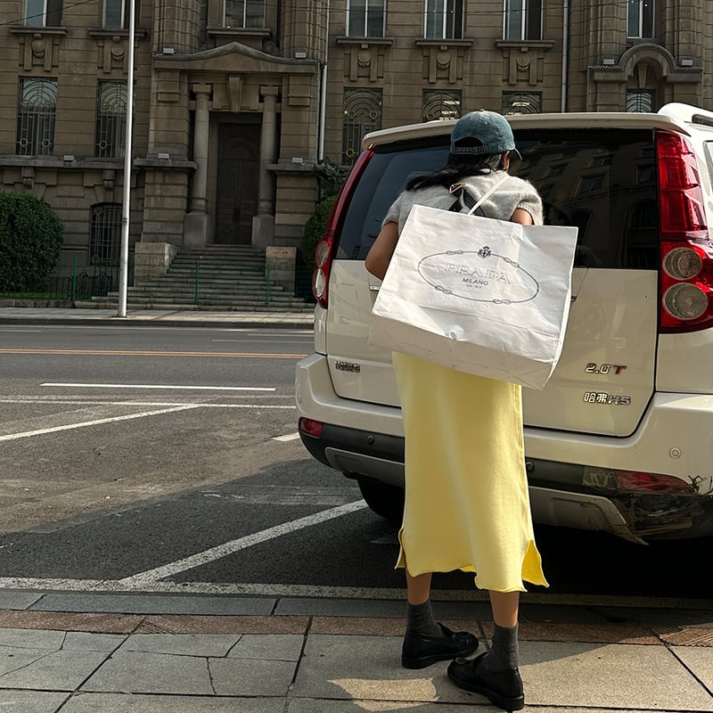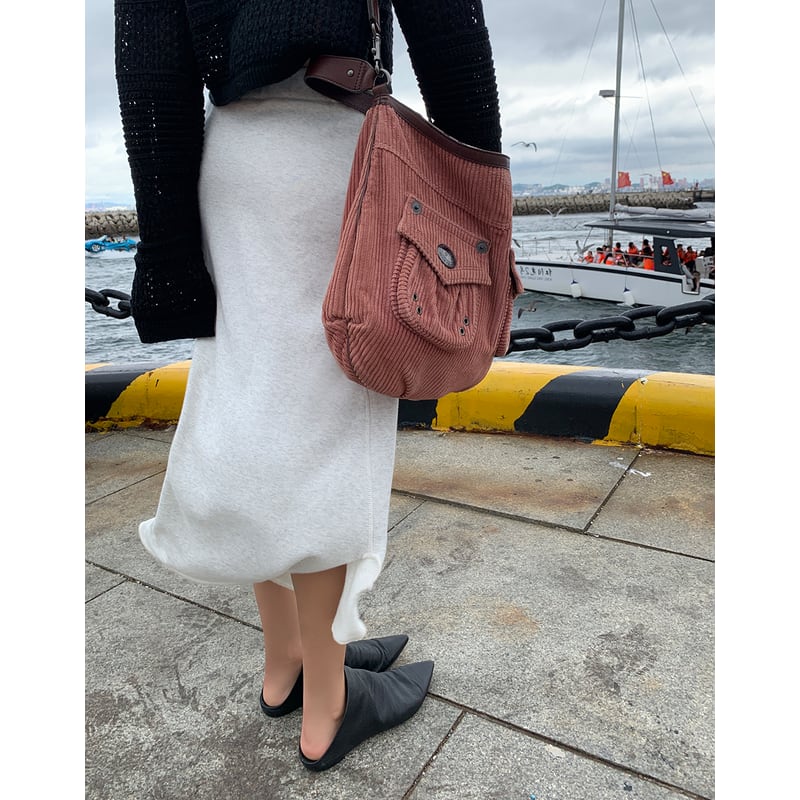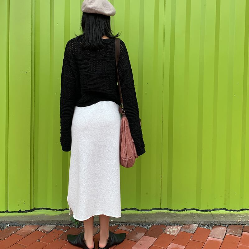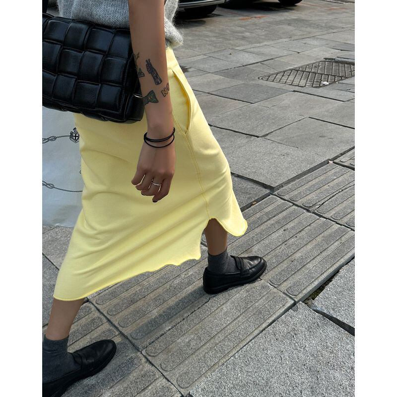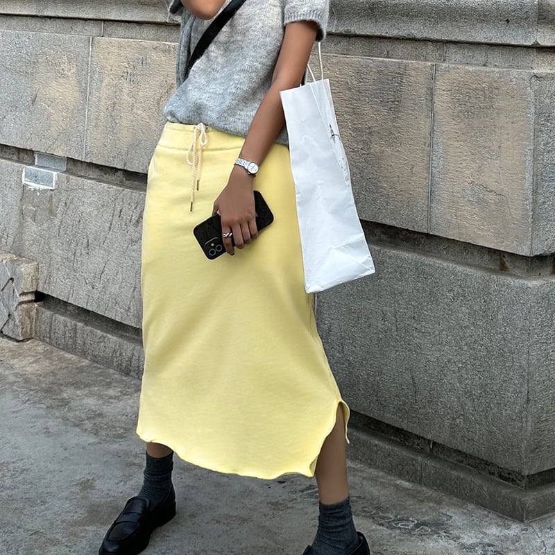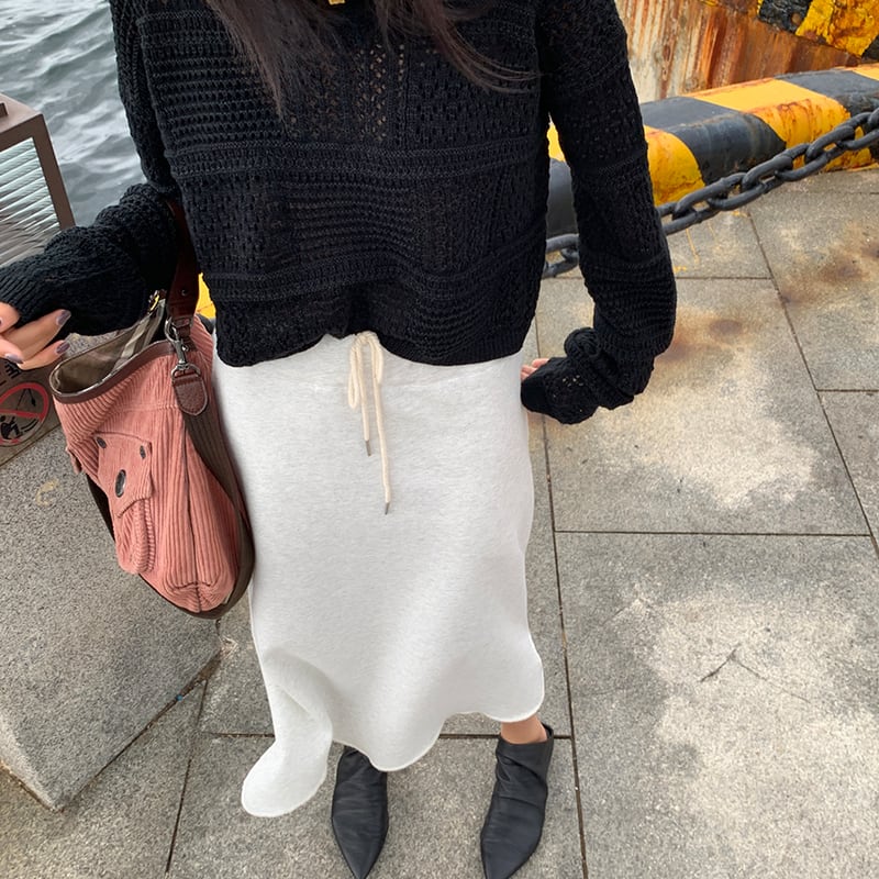 このスカートは、巾着のようなデザインが特徴で、ウエスト部分を調整できるので快適な着用が可能です。