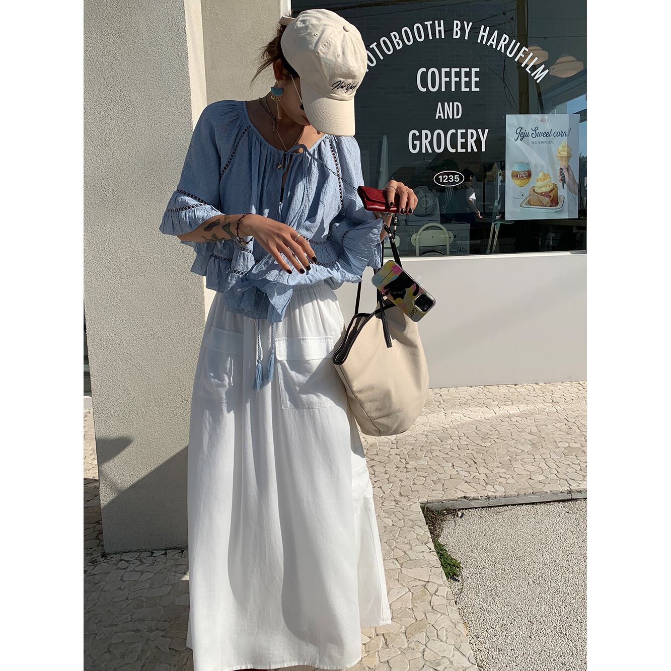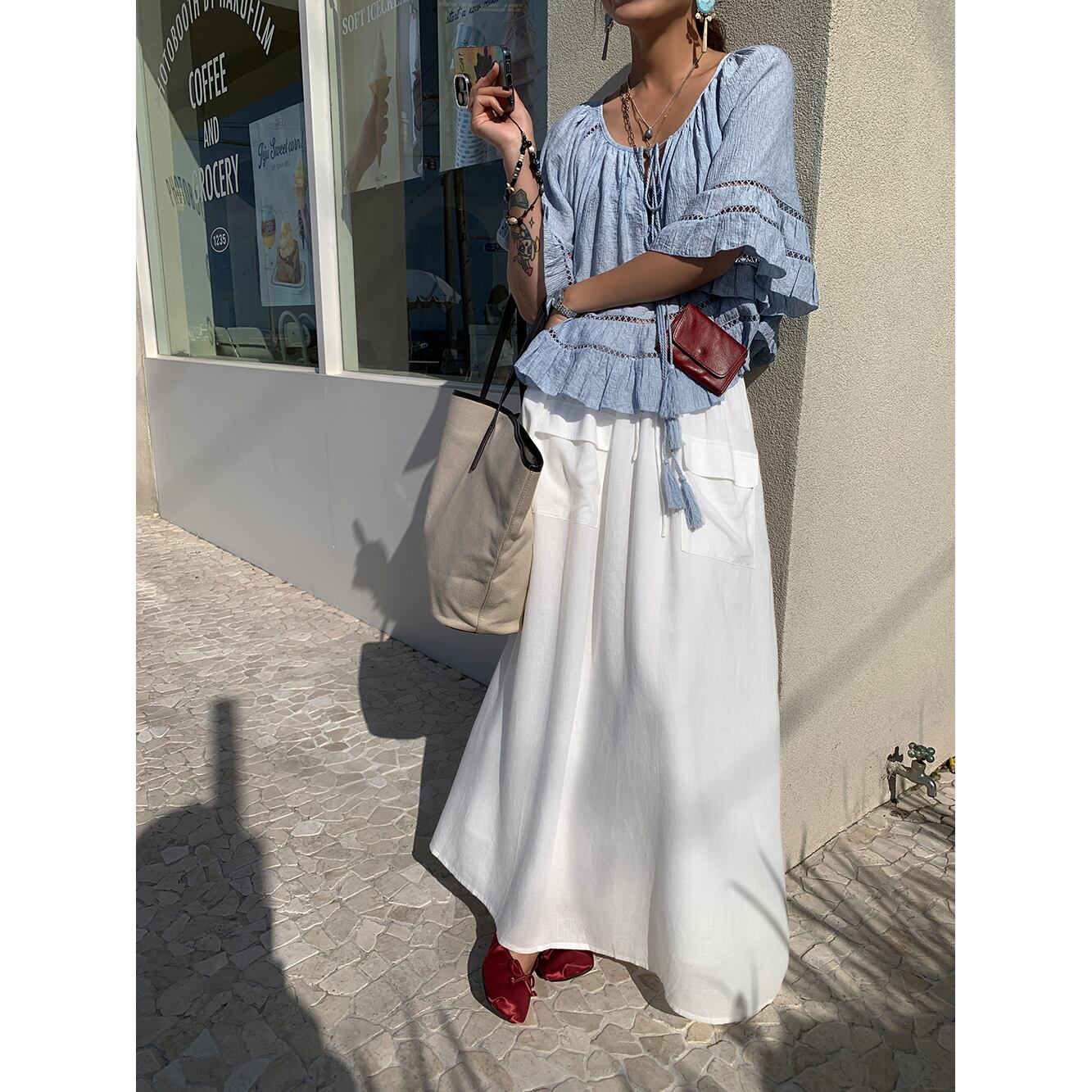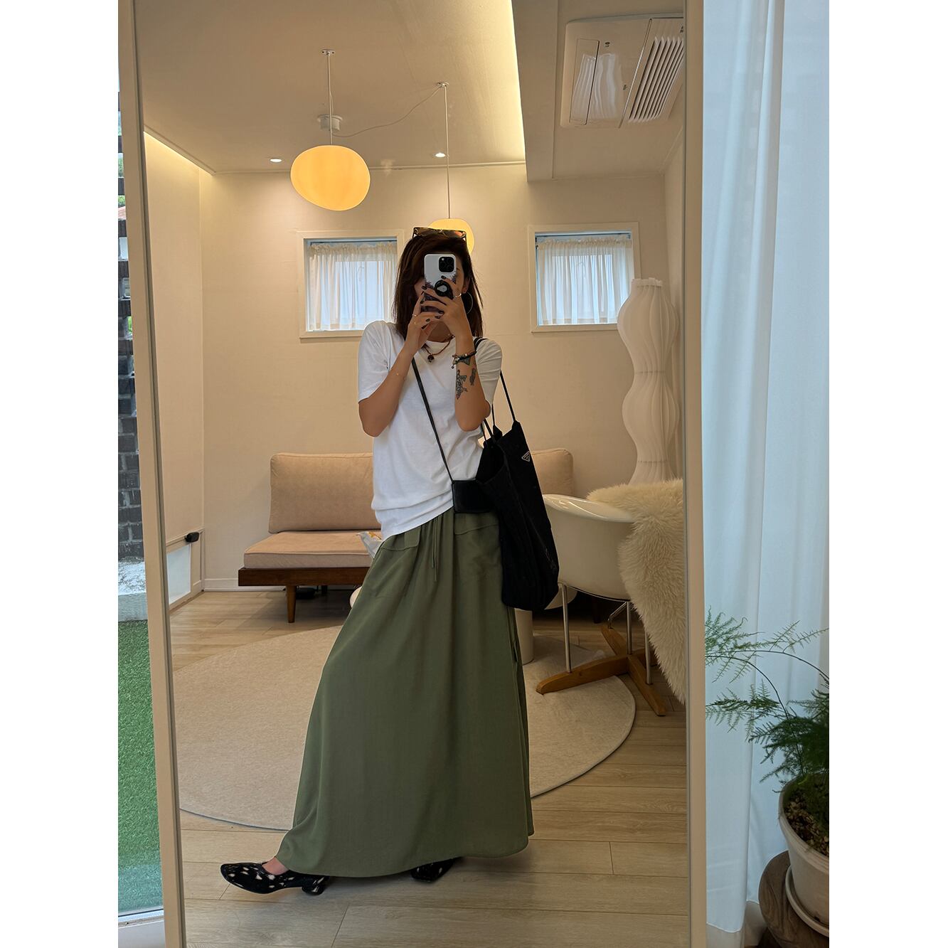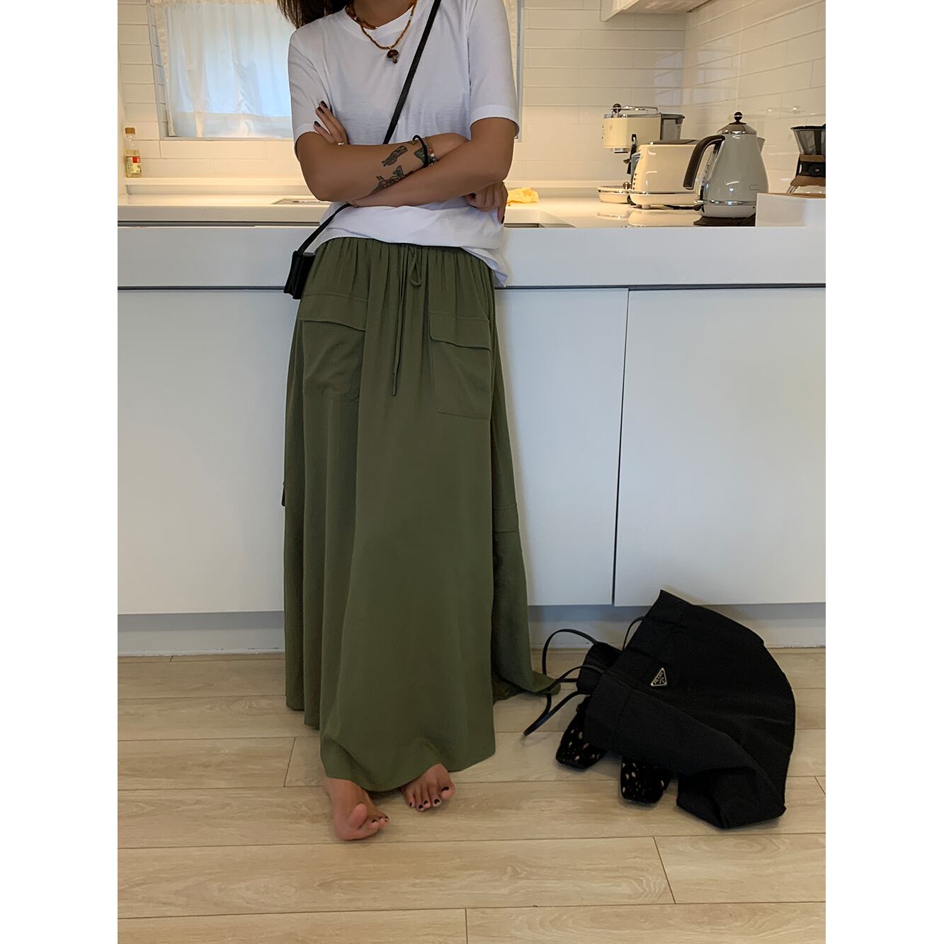 Aラインのシルエットが脚を美しく見せ、流れるようなロング丈が優雅な印象を演出します。