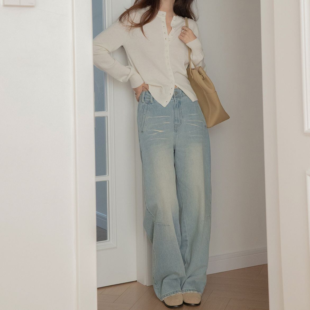 スタイリッシュなシルエットが特徴のフロアレングスジーンズ。