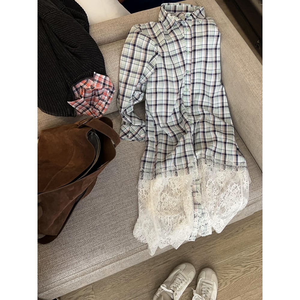 チェック柄とレースステッチがアクセントになった、おしゃれなデザインの長袖シャツです。